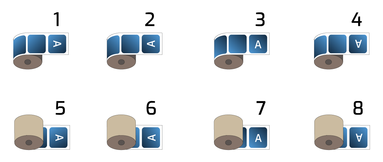 Last but very important is the determination of the roll number. If the label is to be applied by machine it is crucial that the correct roll is ordered. In other words – which direction the label will come out of the roll. There are eight options and probably only one will be the right one for you (or your labeler/applicator). So make a note of the roll number from the images below and be sure to enter it in your order.